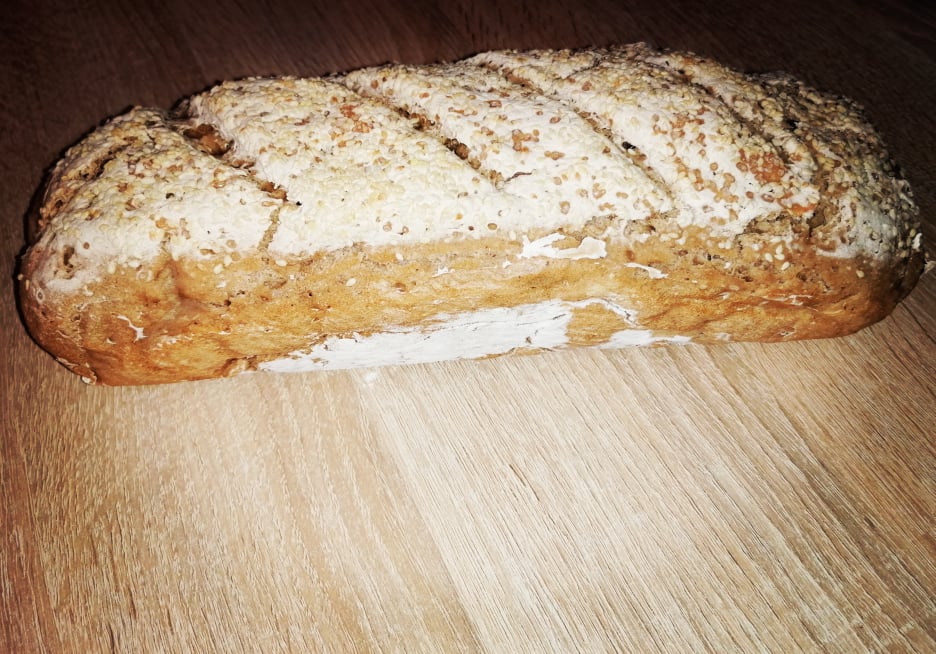 Z cesta vytvoríme vlhkými rukami štvorec s hrúbkou asi 1,5 - 2 cm. Preložíme ho na polovicu (najskôr po šírke a potom po dĺžke). Vytvarujeme bochník, ktorý vložíme do formy na chlieb a necháme podkysnúť ešte 10 minút. Pred pečením ho narežeme mokrým nožom. Pečieme: